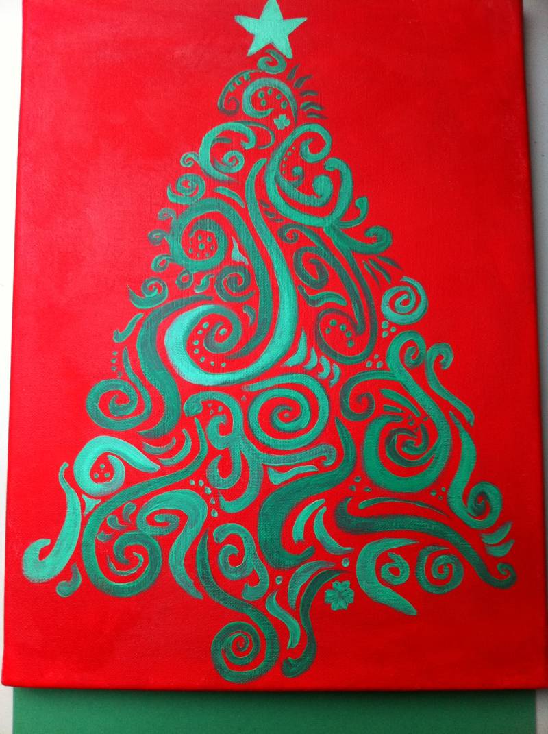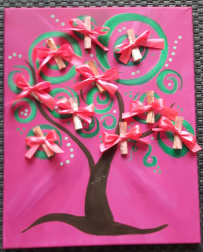 Omdat ik gewoon geld geven niet zo leuk vind, heb ik geldboompjes gemaakt. Op doek schilder ik een boom die bij het feestvarken past en maak daar met gekleurde strikjes de opgevouwen briefjes geld op vast.