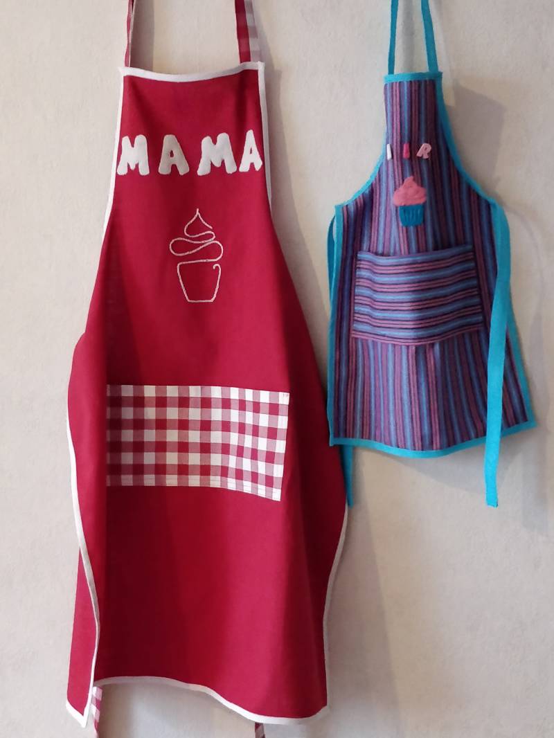 Een schort voor mama en een voor haar kleine keukenprinsesje.